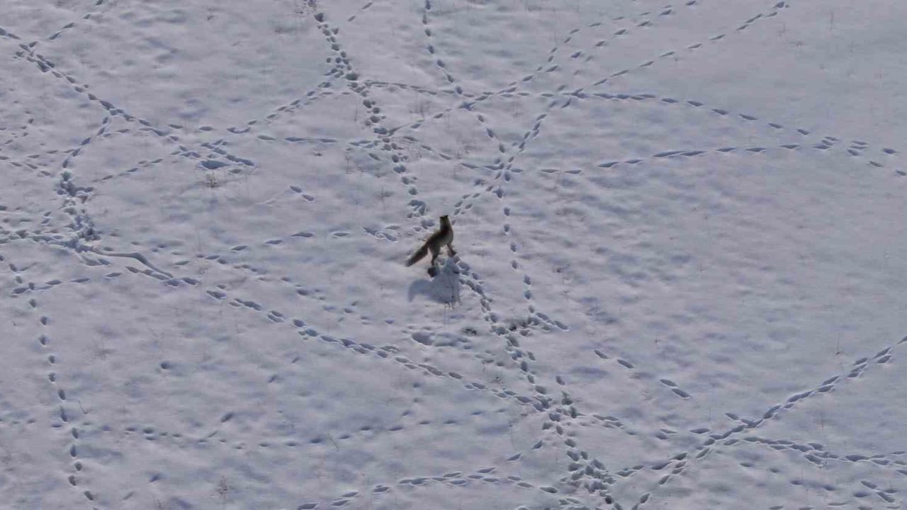 Van'ın karla kaplı yüksek kesimlerinde aç kalan bir tilkinin, avını yakalamak için sergilediği ustalık ve kararlılık dron kamerasına yansıdı.