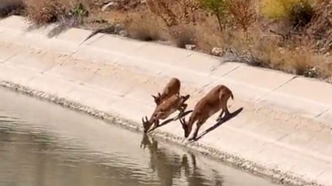 Malatya’nın Darende ilçesinde, nesli tükenme tehlikesi altında olan ve koruma altında bulunan yaban keçileri, sulama kanalında su içerken görüntülendi.