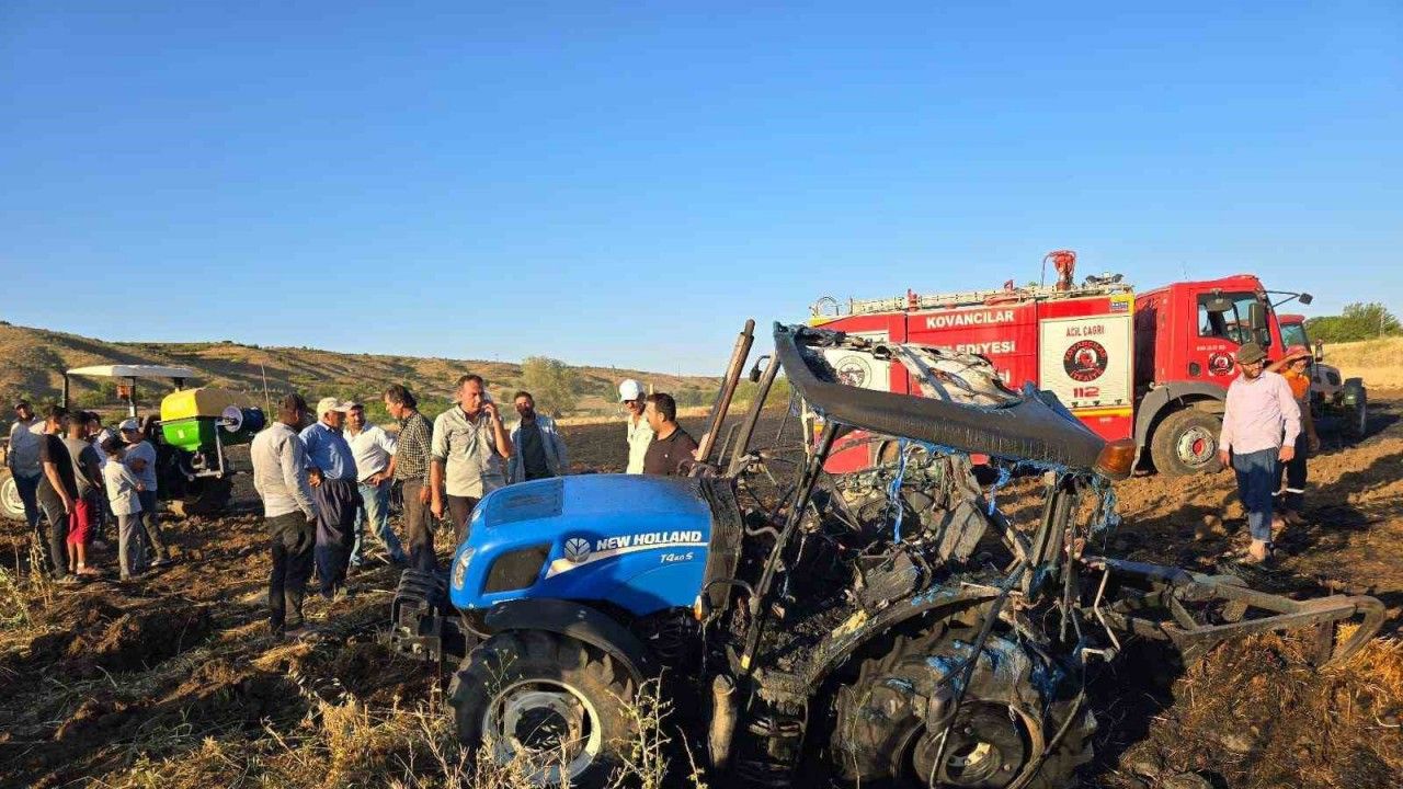 Elazığ’ın Kovancılar ilçesinde çıkan arazi yangınında alevler ortasında kalan traktör kullanılamaz hale geldi.