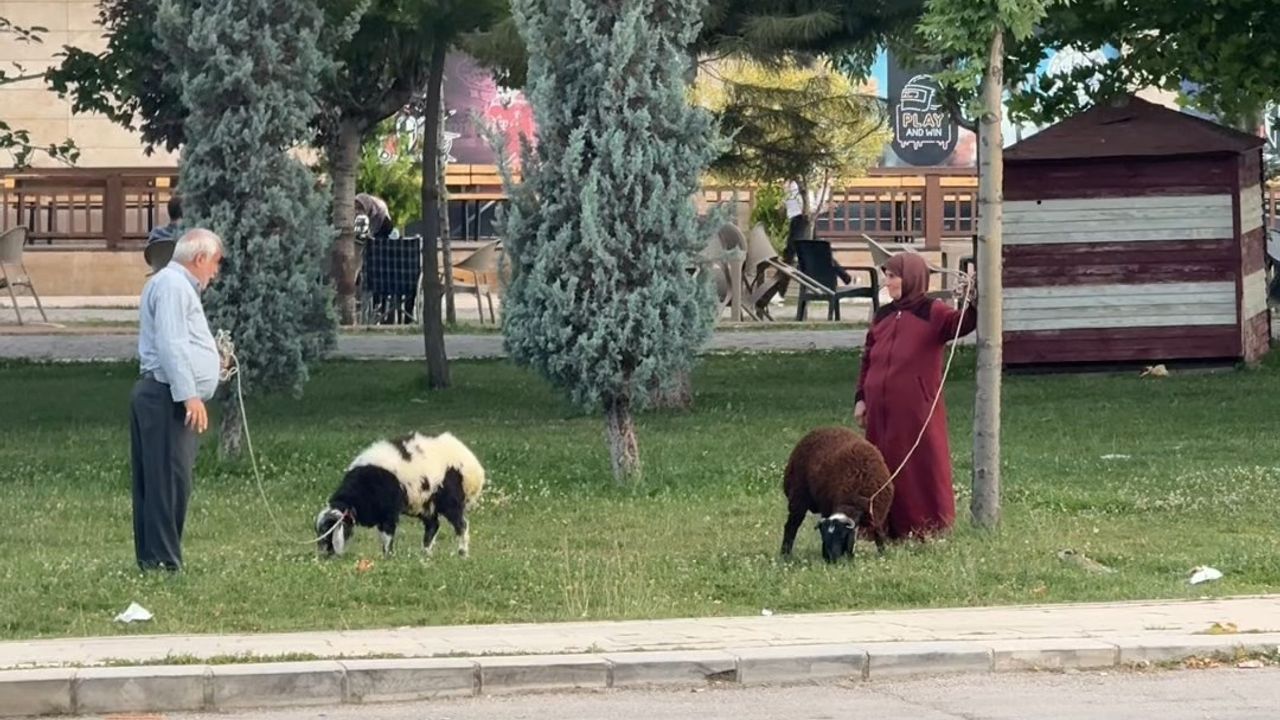 Elazığ’da yaşlı bir çiftin besledikleri koyunları tasma takarak gezdirmesi renkli görüntüler oluşturdu. Kültür Park mevkiinde koyunlarını besleyen çiftin o esnada birbirleriyle sohbet etmesi bir vatandaşın cep telefonu görüntüsüne yansıdı. Çimenlerde bir süre koyunlarını otlatan çift, daha sonra gözden kayboldu.