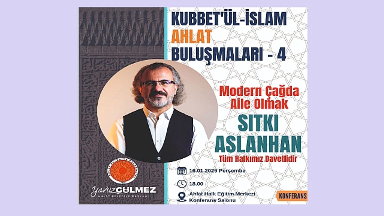 Ünlü yazar Sıtkı Aslanhan Ahlat’ta söyleşide bulunacak. Ahlat Belediyesi tarafından geleneksel olarak düzenlenen ‘Kubbet’ül İslam Ahlat Buluşmaları’ etkinliklerinin kapsamında Ahlat Belediye Başkanı Yavuz Gülmez'in davetiyle ilçeye gelecek olan Ünlü yazar Sıtkı Aslanhan ‘Modern Çağda Aile Olmak’konulu söyleşide bulunacak.