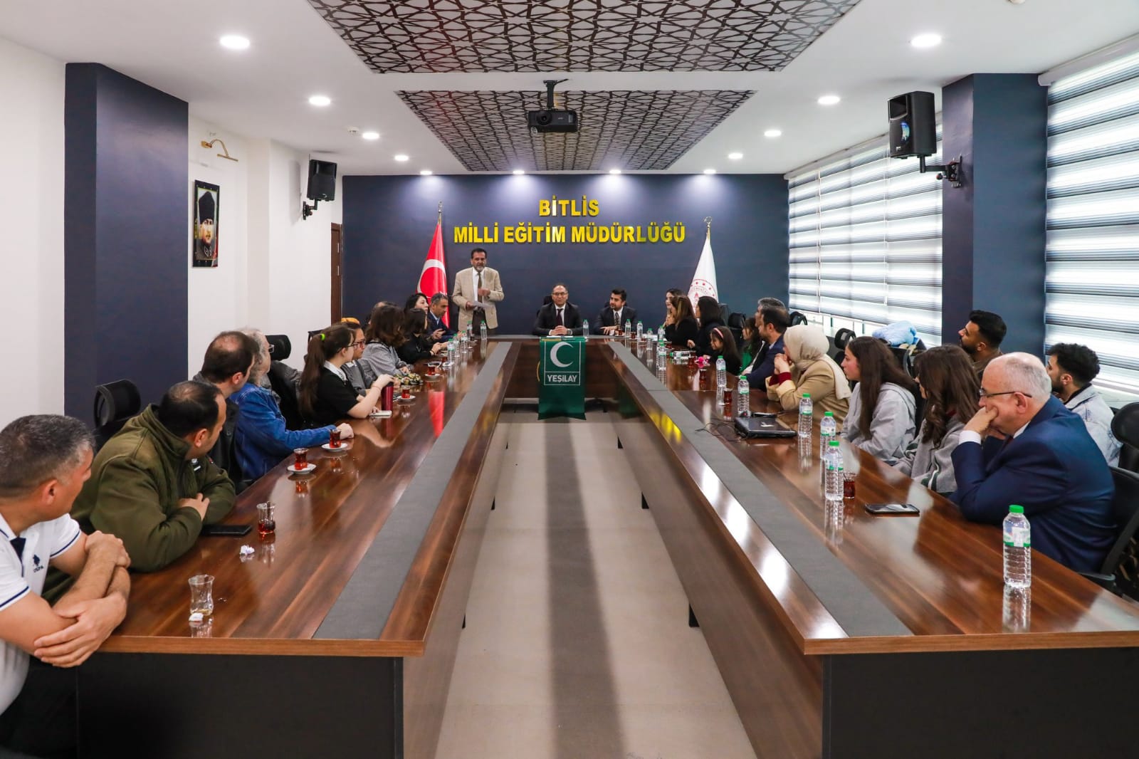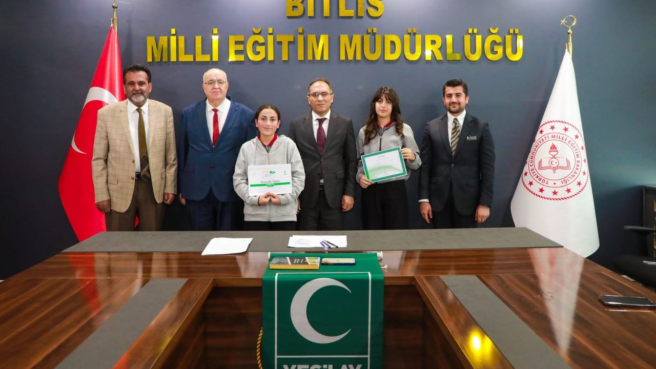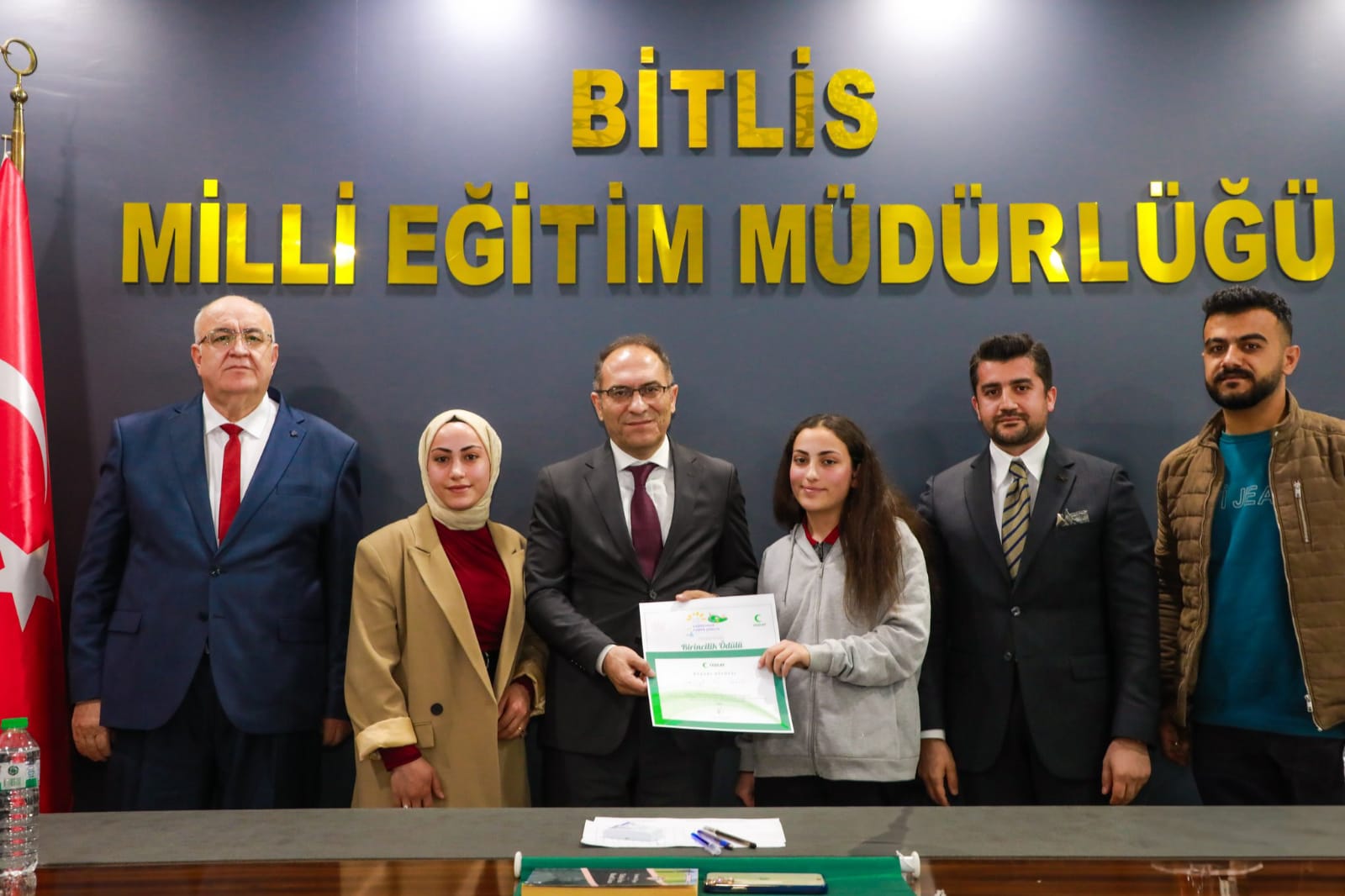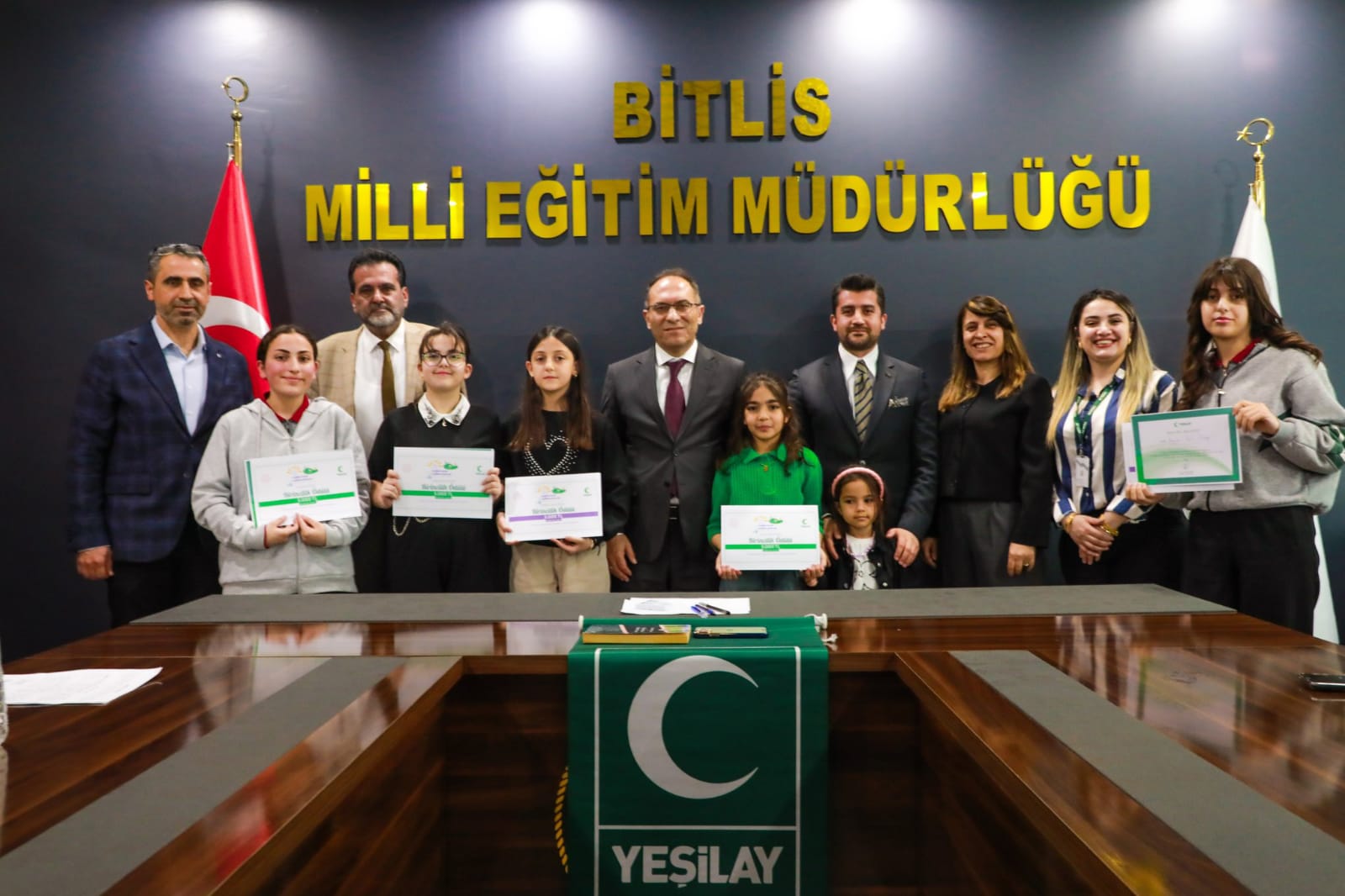 Bitlis İl Milli Eğitim Müdürlüğü ve Yeşilay Bitlis Şubesi işbirliğinde düzenlenen “Sağlıklı Nesil Sağlıklı Gelecek” yarışmasında derece alan öğrenciler ödüllendirildi. Resim ve edebi kategori olmak üzere 2 kategoride düzenlenen yarışmada derece alan öğrencileri okul idarecileri ile birlikte Bitlis İl Milli Eğitim Müdürlüğü toplantı salonunda ağırlayan Bitlis İl Milli Eğitim Müdürü Vedat Kaya, başarılarından dolayı öğrencileri tebrik etti. Derece alan öğrencileri ve danışman öğretmenlerini kutlayan Kaya, ödüllerini takdim ettiği öğrencilerle hatıra fotoğrafı çektirdi.