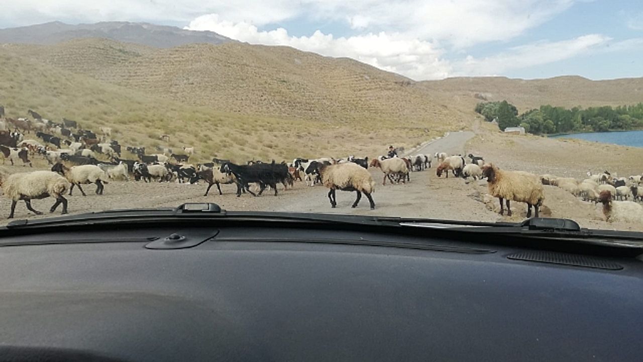 Adilcevaz’ın Aygır Gölü kırsalında aniden yola çıkan küçükbaş hayvan sürüsü sürücülere zor anlar yaşattı.