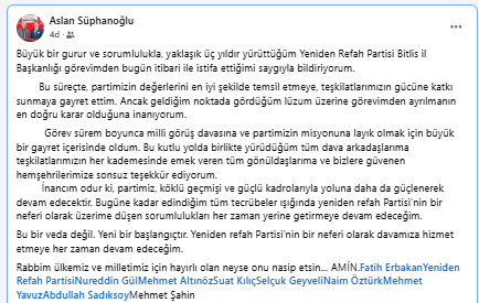 Aslan Süphanoğlu, sosyal medya hesabından yaptığı yazılı açıklamada geldiği noktada istifasının en doğru karar olacağına ifade etti. Süphanoğlu açıklamasında şunları söyledi: “Büyük bir gurur ve sorumlulukla, yaklaşık üç yıldır yürüttüğüm Yeniden Refah Partisi Bitlis il Başkanlığı görevimden bugün itibari ile istifa ettiğimi saygıyla bildiriyorum. Bu süreçte, partimizin değerlerini en iyi şekilde temsil etmeye, teşkilatlarımızın gücüne katkı sunmaya gayret ettim. Ancak geldiğim noktada gördüğüm lüzum üzerine görevimden ayrılmanın en doğru karar olduğuna inanıyorum. Görev sürem boyunca milli görüş davasına ve partimizin misyonuna layık olmak için büyük bir gayret içerisinde oldum. Bu kutlu yolda birlikte yürüdüğüm tüm dava arkadaşlarıma teşkilatlarımızın her kademesinde emek veren tüm gönüldaşlarıma ve bizlere güvenen hemşehrilerimize sonsuz teşekkür ediyorum. İnancım odur ki, partimiz, köklü geçmişi ve güçlü kadrolarıyla yoluna daha da güçlenerek devam edecektir. Bugüne kadar edindiğim tüm tecrübeler ışığında yeniden refah Partisi’nin bir neferi olarak üzerime düşen sorumlulukları her zaman yerine getirmeye devam edeceğim. Bu bir veda değil. Yeni bir başlangıçtır. Yeniden refah Partisi’nin bir neferi olarak davamıza hizmet etmeye her zaman devam edeceğim.”