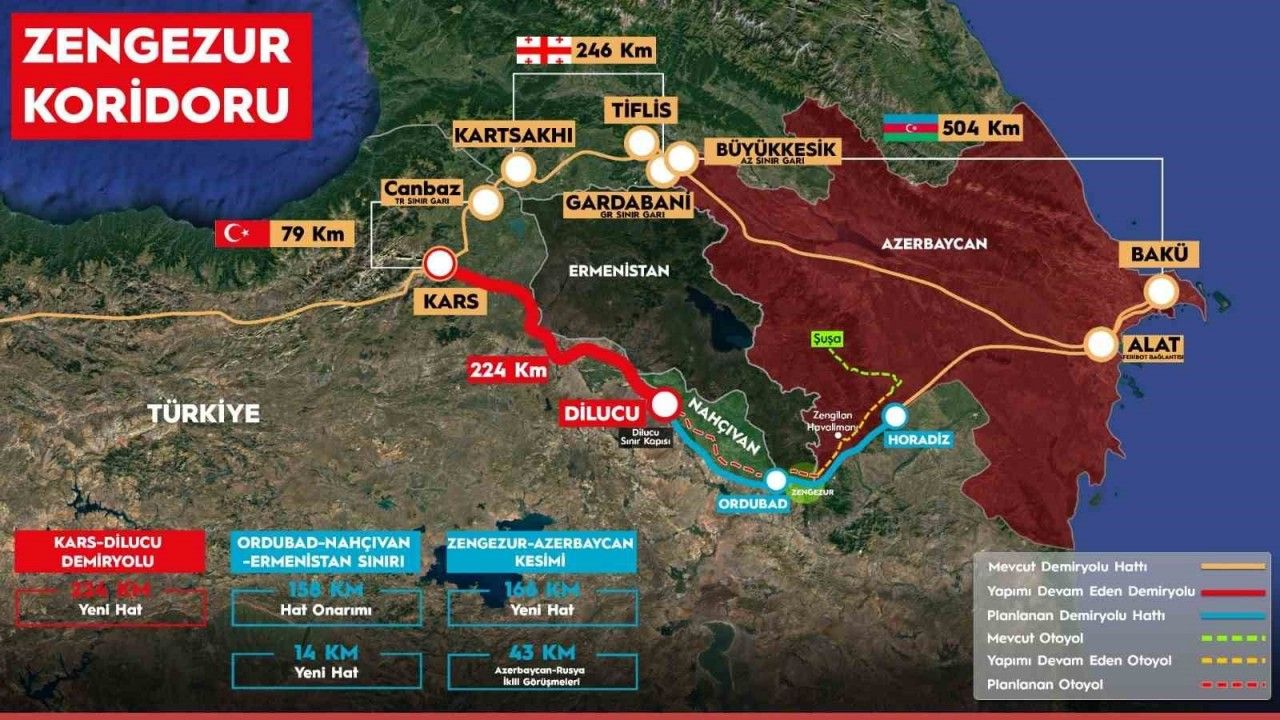 Ulaştırma ve Altyapı Bakanı Abdulkadir Uraloğlu, Kars-Iğdır-Aralık-Dilucu Demiryolu Hattı’nın temelinin 22 Ağustos Cuma günü atılacağını duyurdu. Bakan Uraloğlu, 224 kilometrelik hattın Zengezur Koridoru’nun önemli bir parçası olduğunu belirterek "Zengezur Koridoru’nun işlerlik kazanmasıyla birlikte Pekin’den Londra’ya kadar uzanan doğu-batı hattı daha verimli işleyecek" dedi.