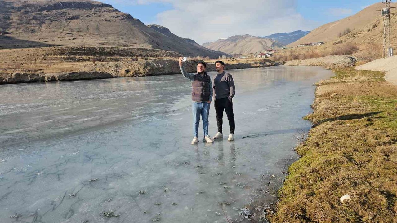 Van'ın Erciş ilçesinde etkili olan dondurucu soğuklar nedeniyle Zilan Çayı dondu.