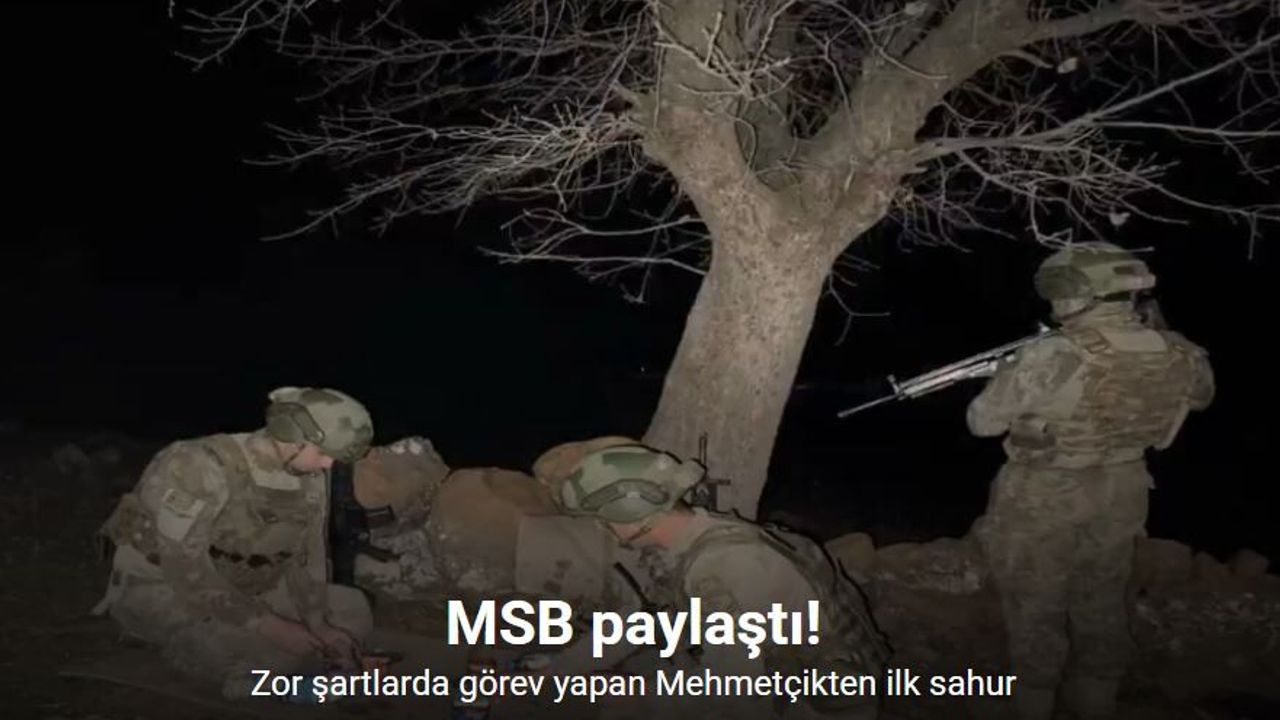 Yapılan paylaşımda, "Tüm İslam aleminin Ramazan ayı mübarek olsun. Yurdun dört bir yanında, sınır ötesinde ve dünyanın birçok bölgesinde görev yapan Kahraman Mehmetçiklerimiz de ilk sahurlarını yaptı" notuyla paylaştığı görüntü kısa sürede yaklaşık 50 bin kişi tarafından izlendi.